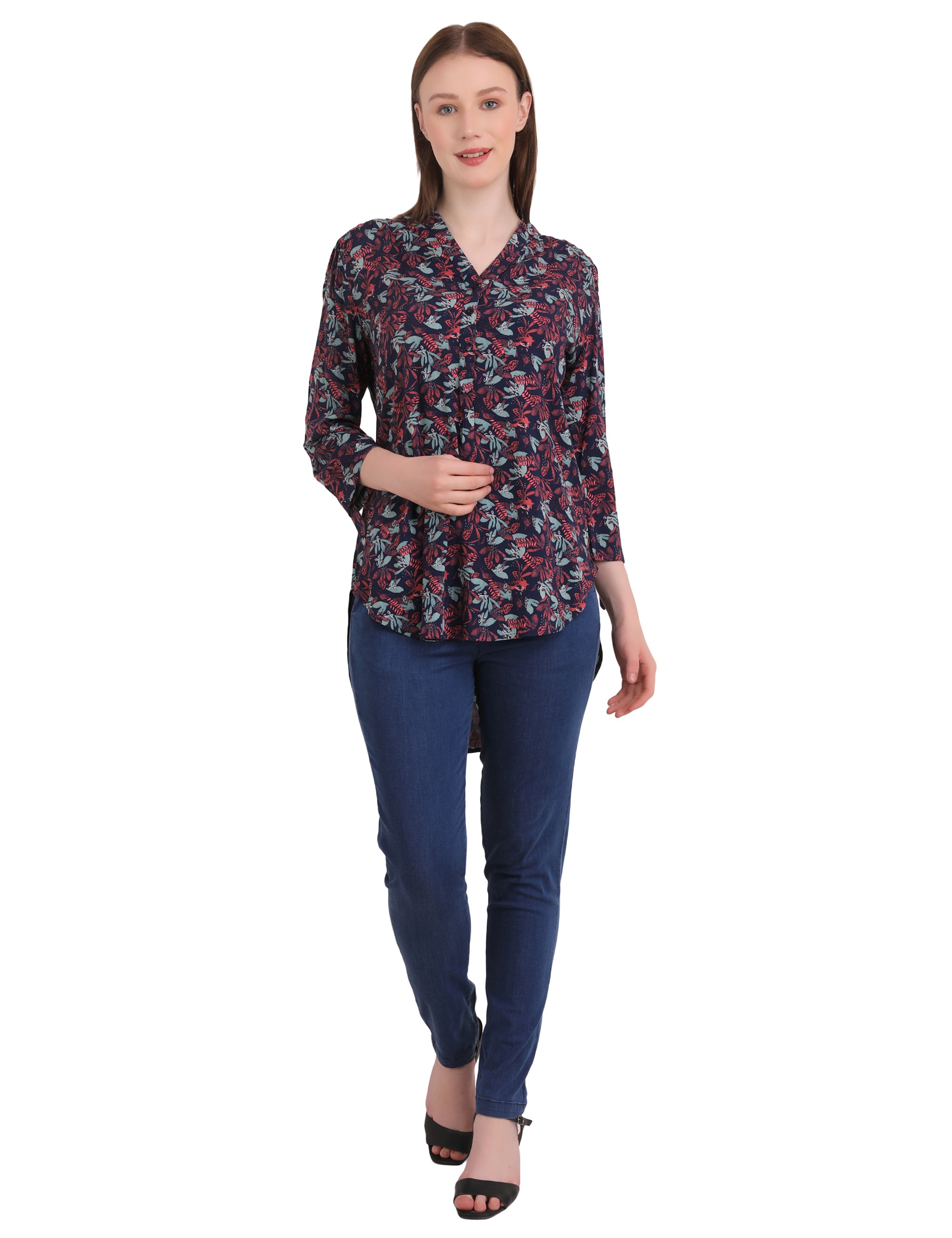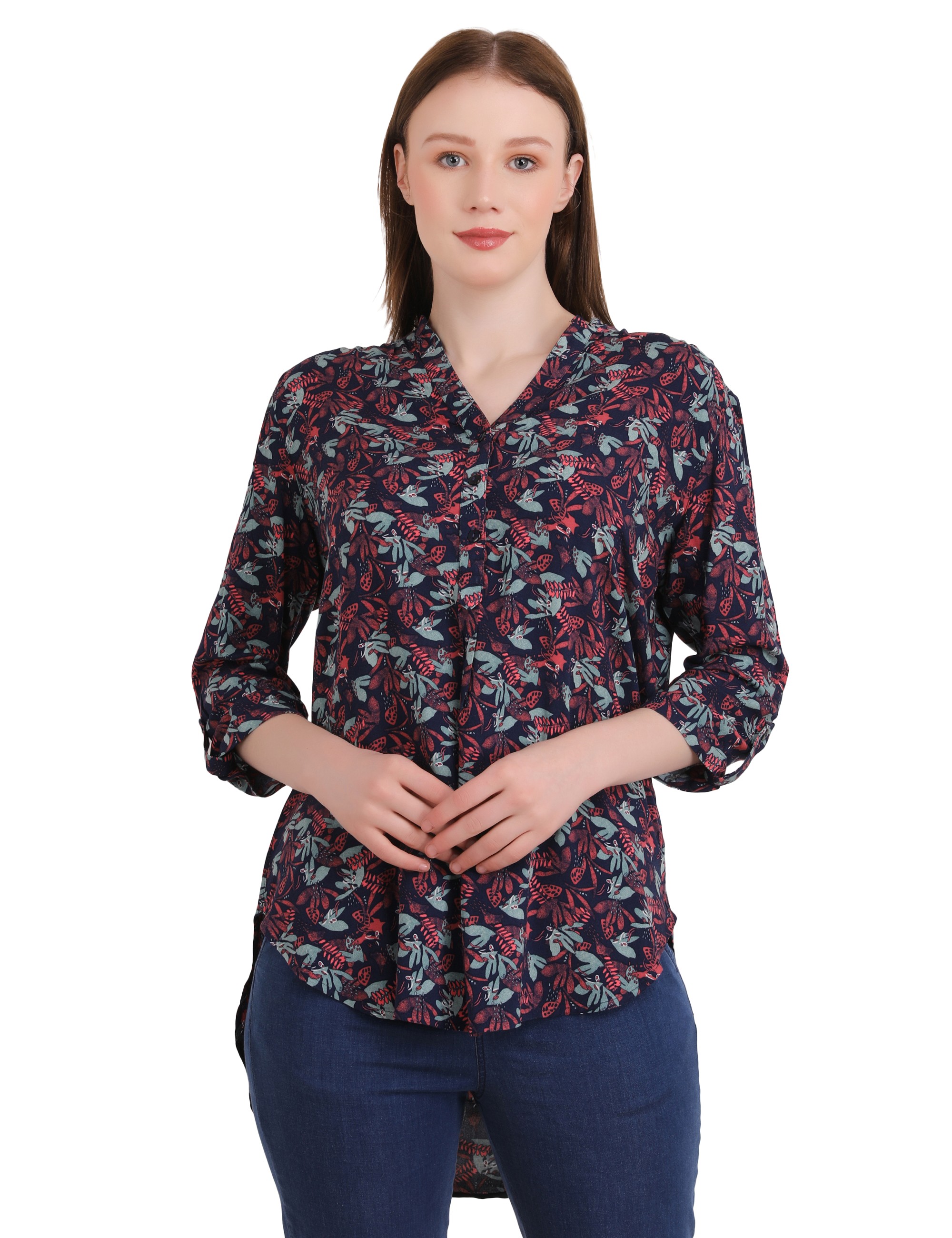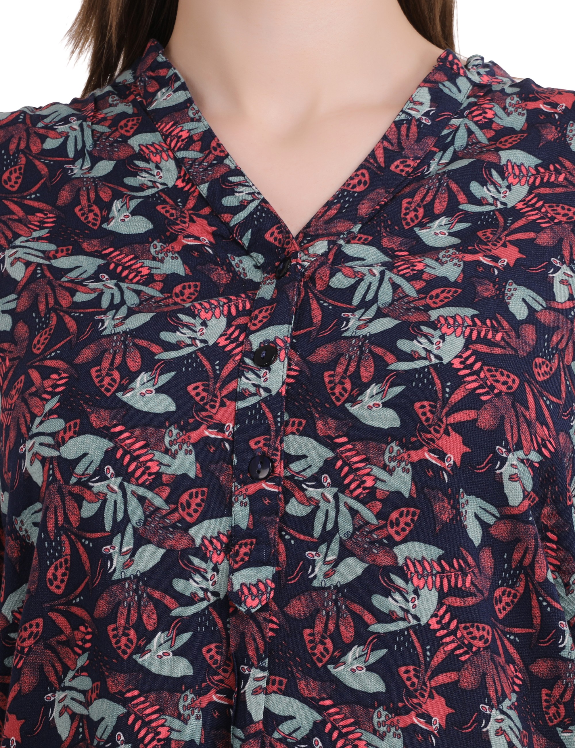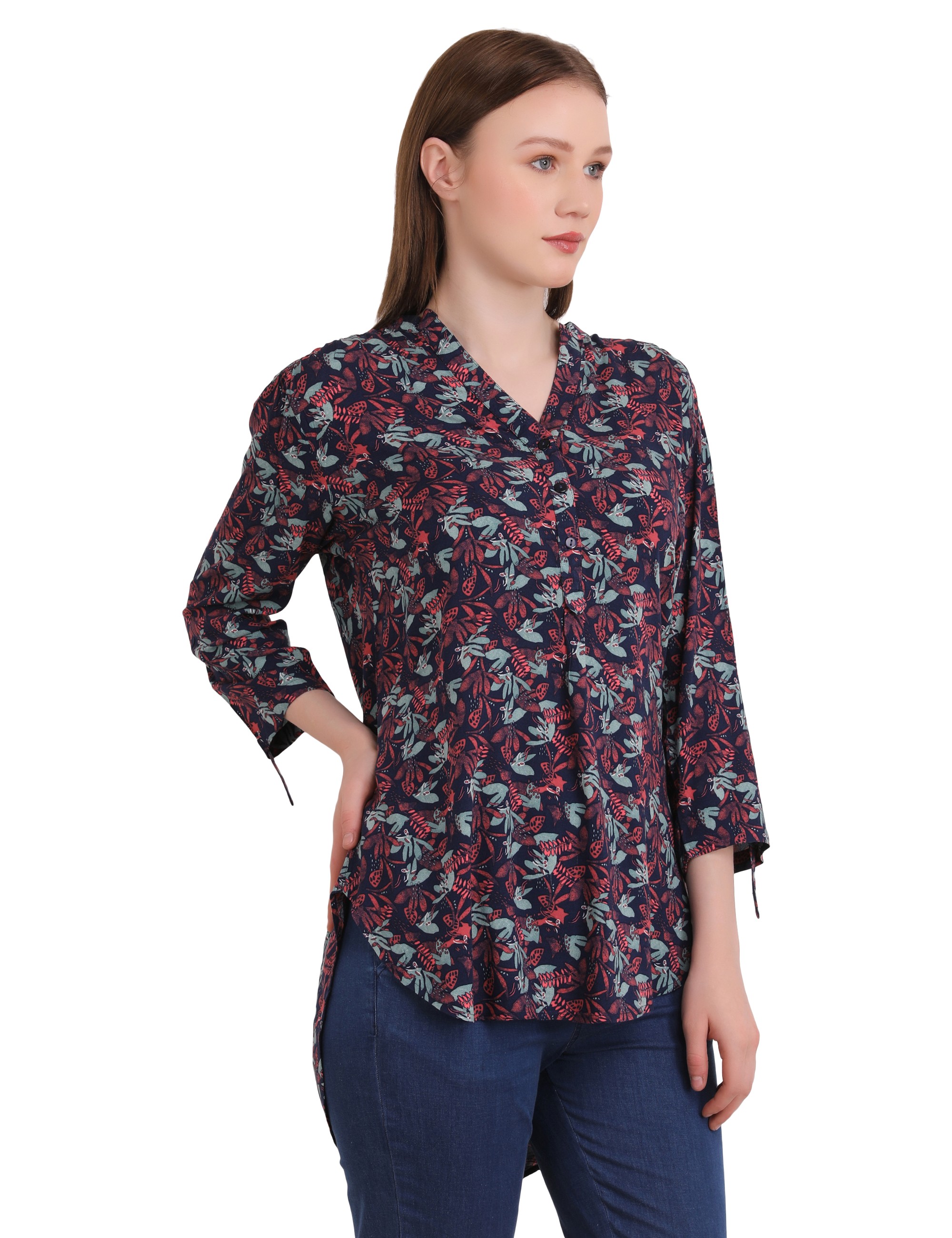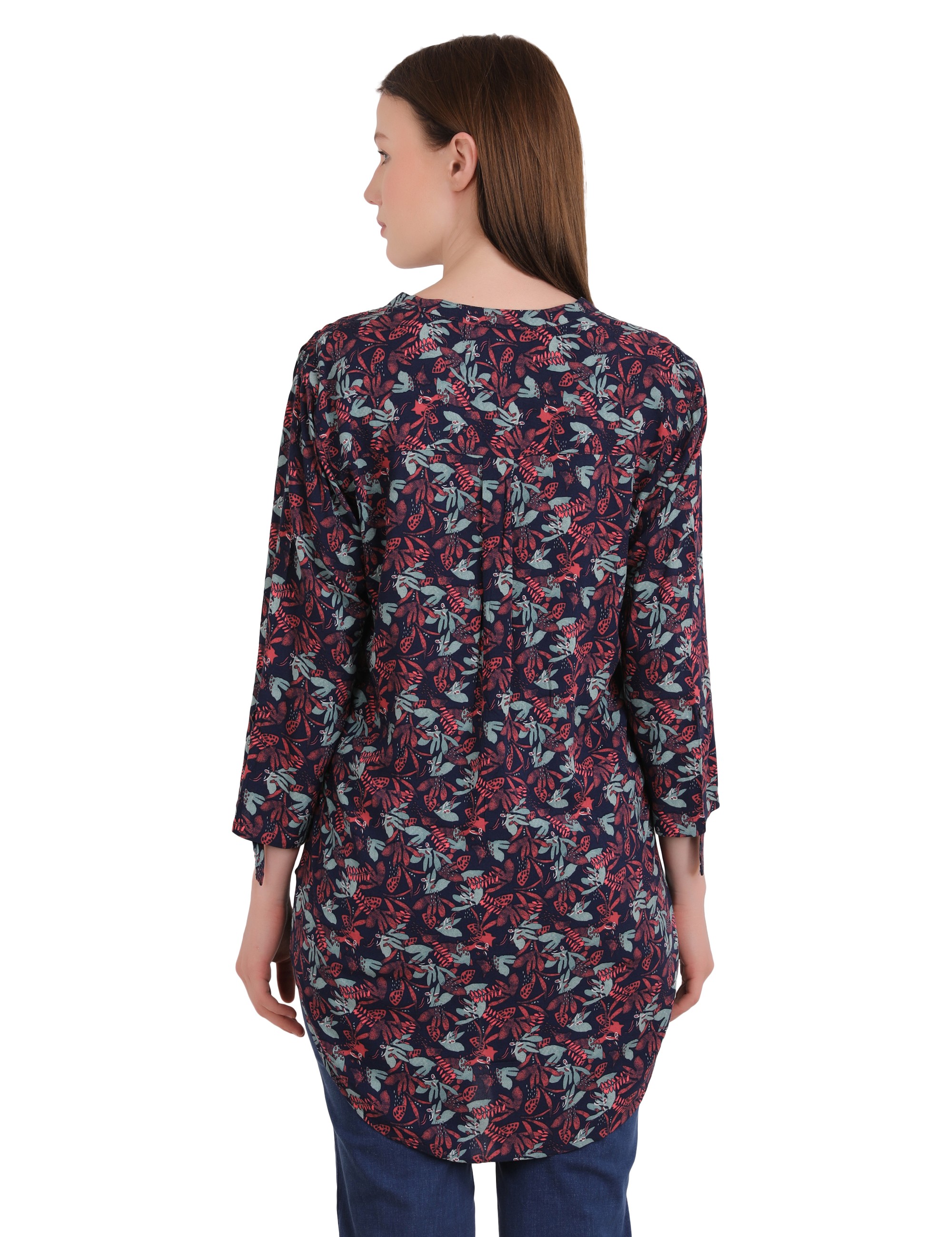 Woman Dark Pink Small Leaf Printed Long Top